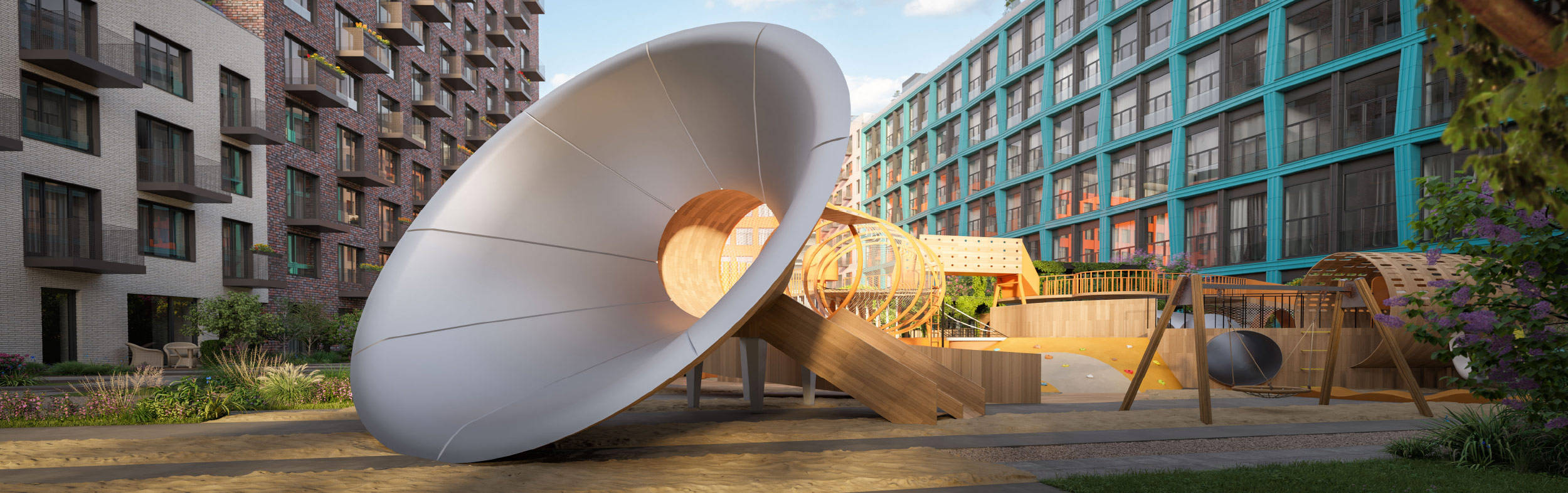 - двор-парк внутри квартала, где приятно посидеть в тени деревьев, пока ваши дети резвятся на одной из лучших детских площадок в Москве