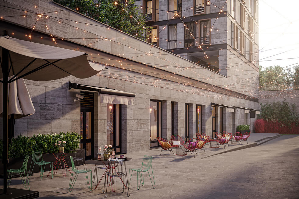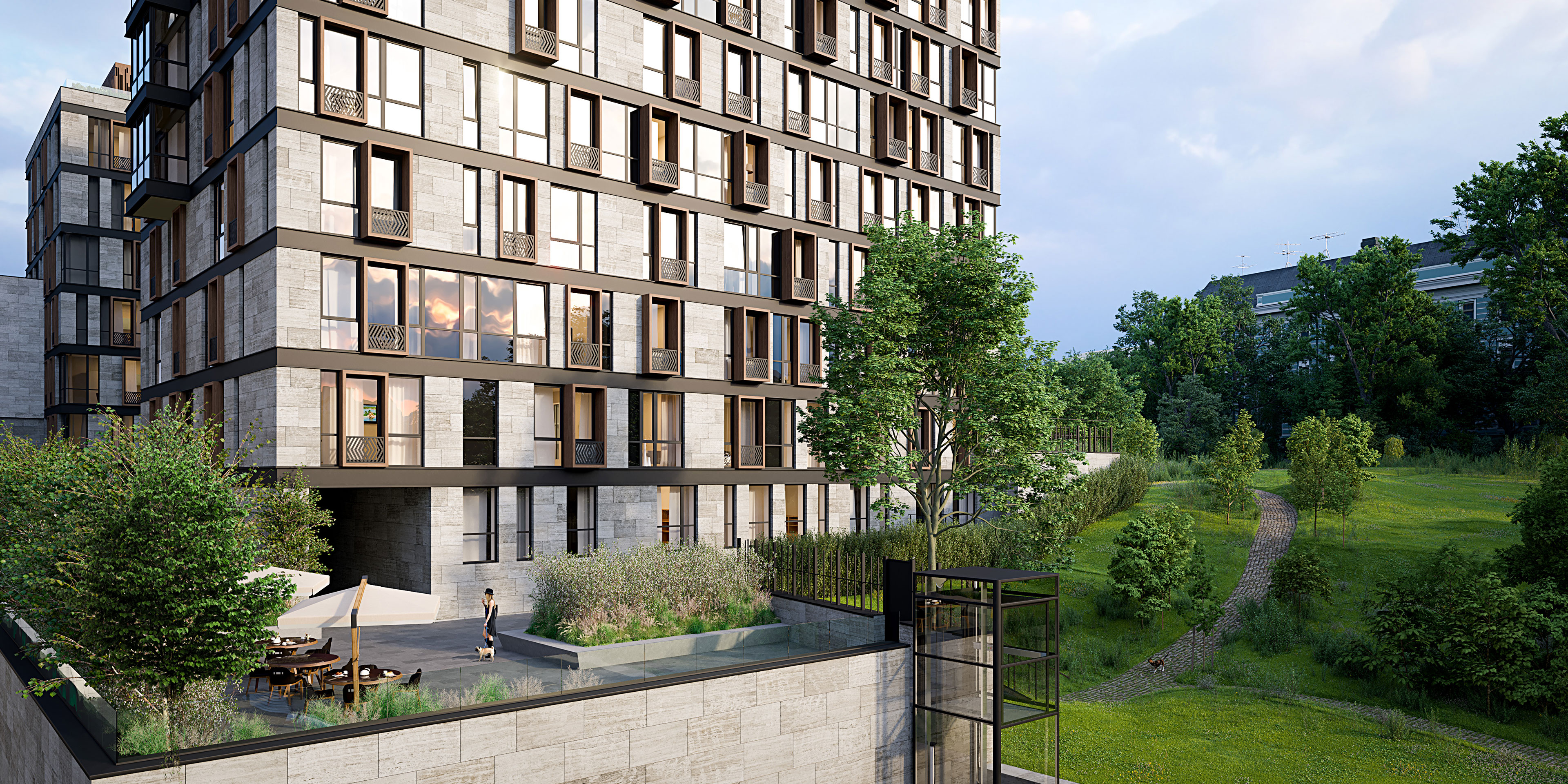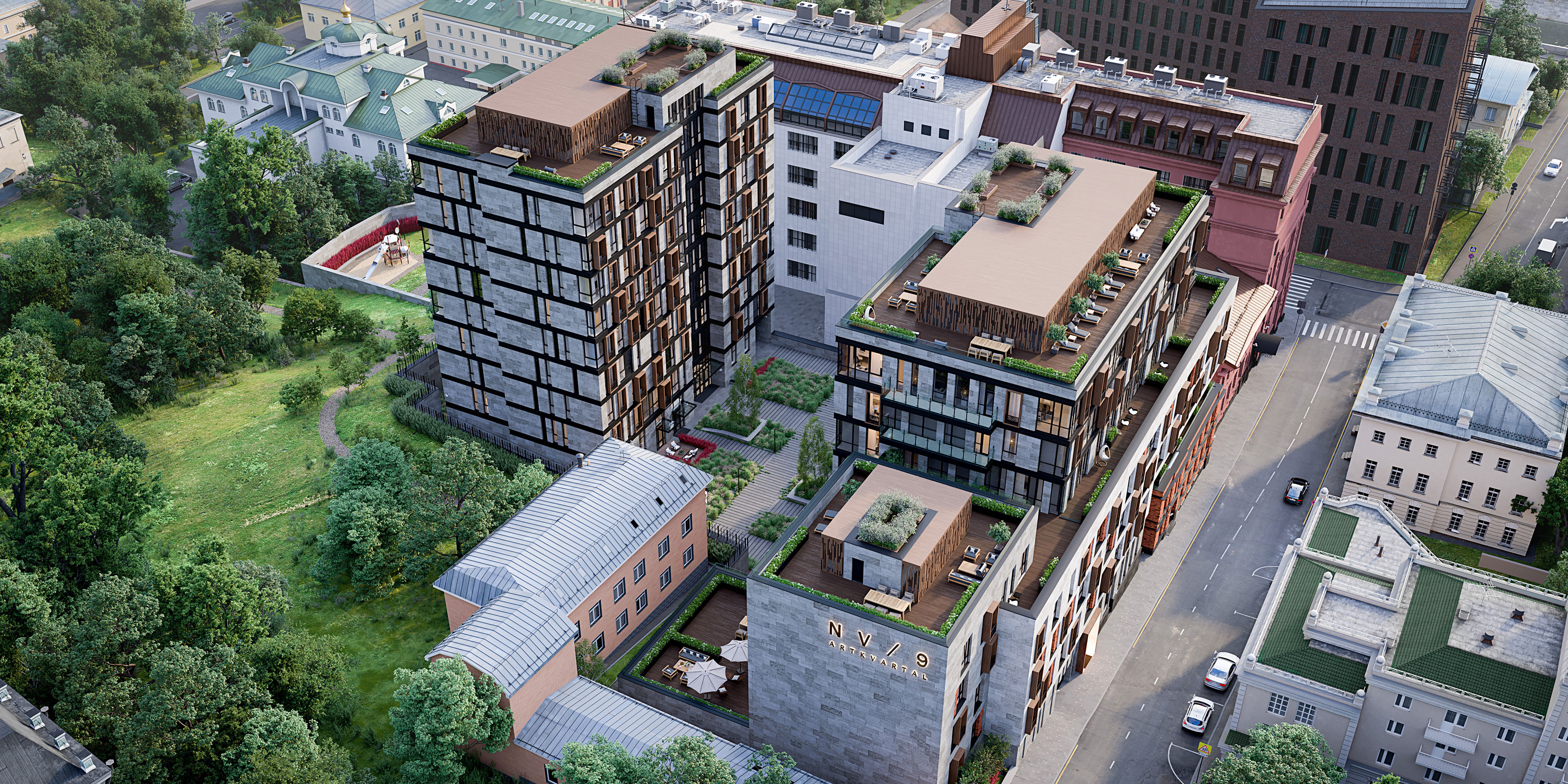 - шесть пентхаусов с каминами и выходом на крышу в главном корпусе, квартиры с террасами или собственными патио